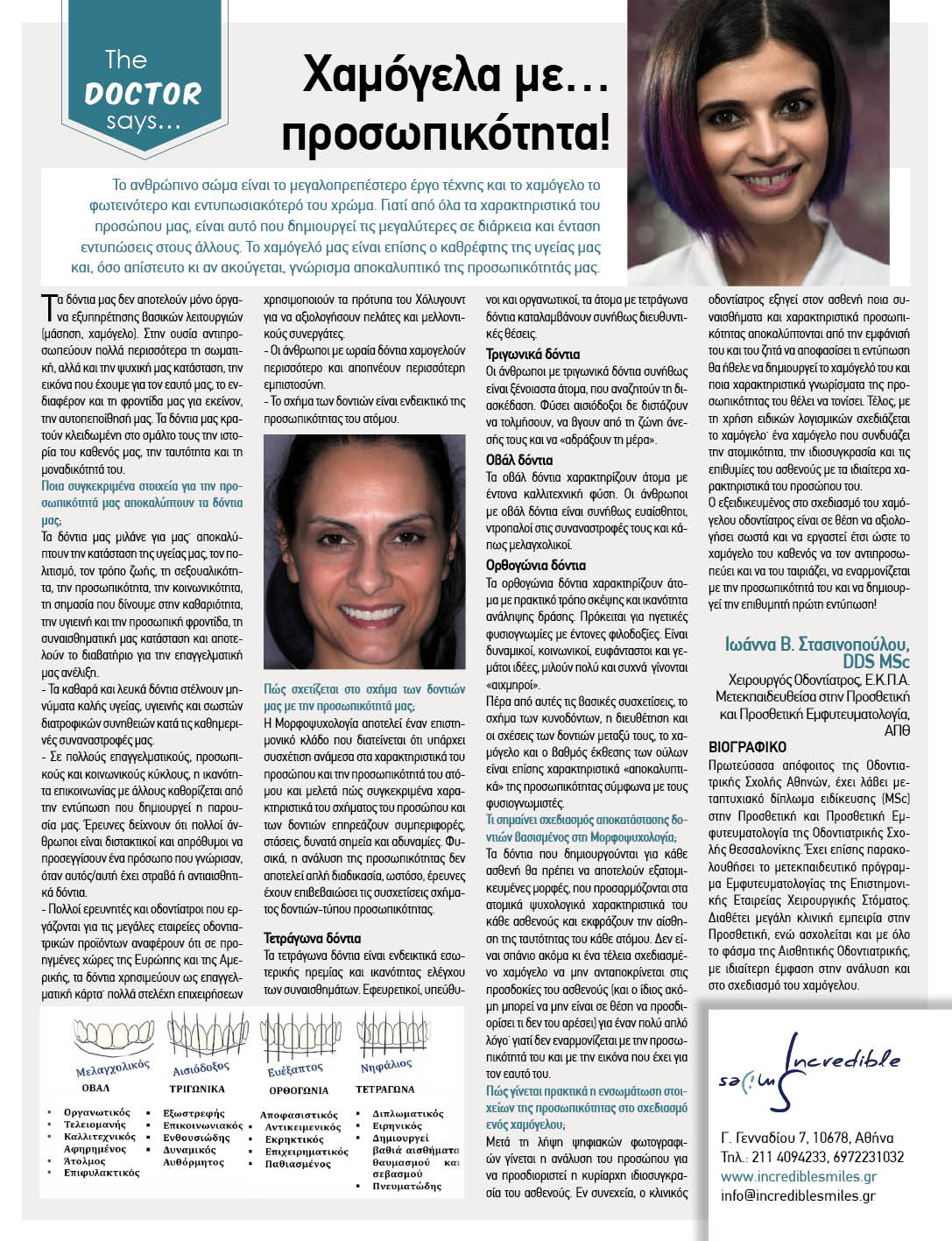 Όσο απίστευτο κι αν ακούγεται, τα δόντια μας δεν αποτελούν μόνο όργανα εξυπηρέτησης βασικών λειτουργιών (μάσηση, χαμόγελο). Στην ουσία αντιπροσωπεύουν πολλά περισσότερα∙ τη σωματική, αλλά και την ψυχική μας κατάσταση, την εικόνα που έχουμε για τον εαυτό μας, το ενδιαφέρον και τη φροντίδα μας για εκείνον, την αυτοπεποίθησή μας.